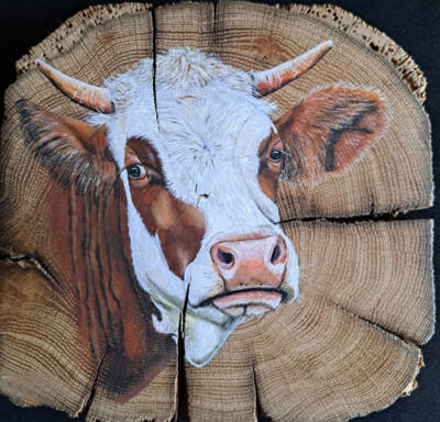 Kuhporträts auf jahrhundertealten Eichenbalken.