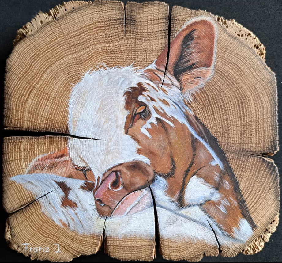 Diese Kombination aus malerischer Präzision und gelebter Geschichte entfaltet eine besondere Wirkung. Die antiken Balken – einst tragende Elemente alter Allgäuer Gebäude – tragen Spuren vergangener Jahrhunderte: Kerben, Risse, Patina. Franz nutzt diese Oberflächen nicht als bloßen Malgrund, sondern als Dialogpartner. Seine Kühe treten aus dem Holz hervor wie aus einer anderen Zeit, und doch wirken sie unmittelbar, gegenwärtig und überraschend charakterstark.