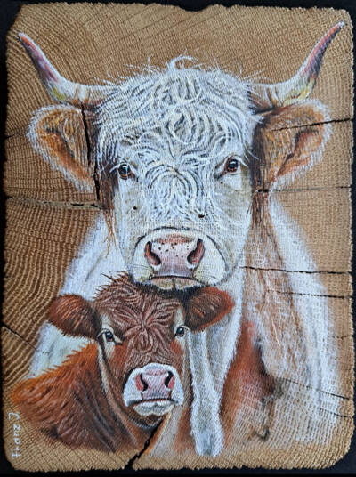 Diese Kombination aus malerischer Präzision und gelebter Geschichte entfaltet eine besondere Wirkung. Die antiken Balken – einst tragende Elemente alter Allgäuer Gebäude – tragen Spuren vergangener Jahrhunderte: Kerben, Risse, Patina. Franz nutzt diese Oberflächen nicht als bloßen Malgrund, sondern als Dialogpartner. Seine Kühe treten aus dem Holz hervor wie aus einer anderen Zeit, und doch wirken sie unmittelbar, gegenwärtig und überraschend charakterstark.